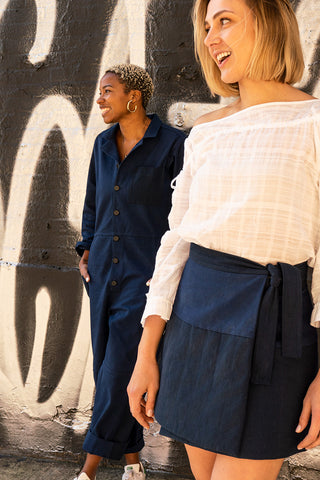 The trapunto quilting in our mini length indigo wrap skirt will make your other denim jealous. Mid-weight cotton twill in two tone indigo with a structured yet soft hand. Ties at waist via a channel-stitched waistband and is fully lined.